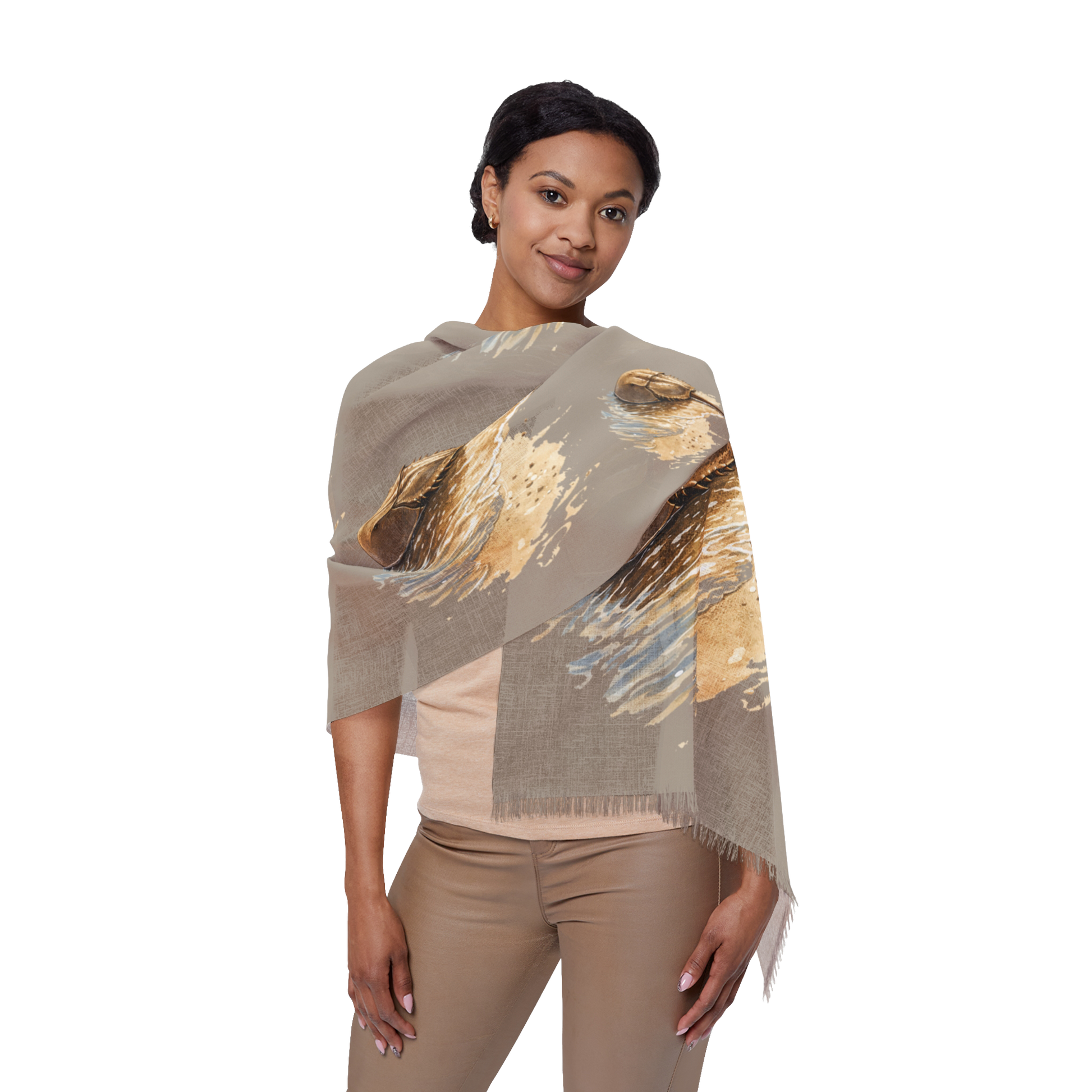 This lightweight wrap carries the quiet strength of low tide and weathered shoreline. Remi, ancient and enduring, rests against warm earth tones brushed with soft movement of water and sand. The composition feels grounded and timeless, balanced by subtle strokes of coastal blue.